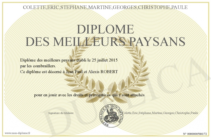 Envoyez par email votre Diplôme des meilleurs paysans personalisé