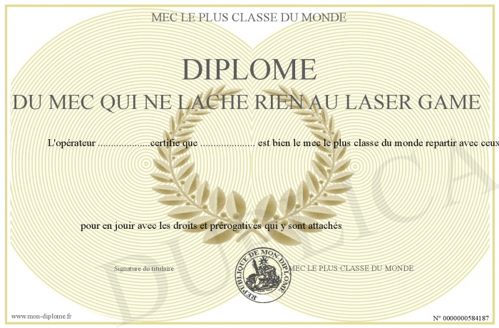 Envoyez par email votre DIPLOME DU MEC QUI NE LACHE RIEN AU LASER GAME personalisé