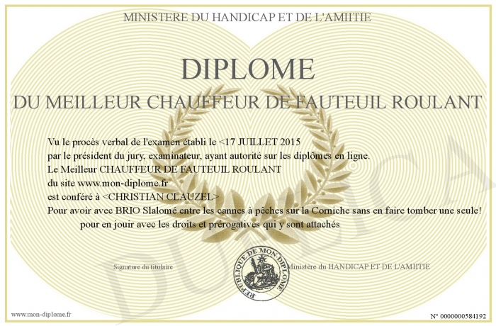 Envoyez par email votre Diplôme du MEILLEUR CHAUFFEUR DE FAUTEUIL ROULANT personalisé