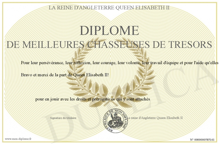 Envoyez par email votre Diplôme de meilleures chasseuses de trésors personalisé