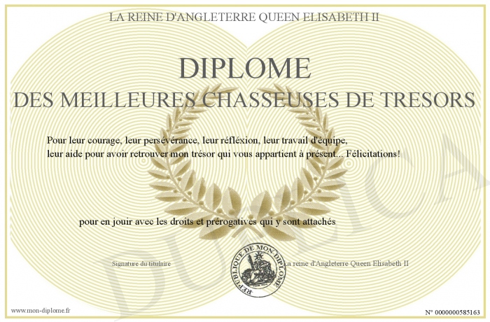 Envoyez par email votre Diplôme des meilleures chasseuses de trésors personalisé