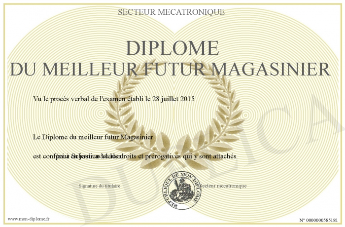 Envoyez par email votre Diplôme du meilleur futur Magasinier personalisé