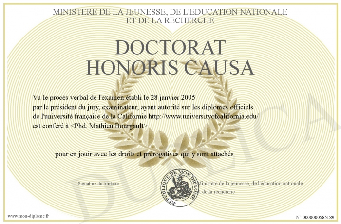 Envoyez par email votre Doctorat Honoris Causa personalisé