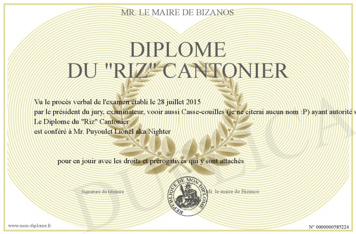 Envoyez par email votre Diplôme du -Riz- Cantonier personalisé