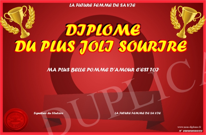 Envoyez par email votre DIPLOME DU PLUS JOLI SOURIRE personalisé
