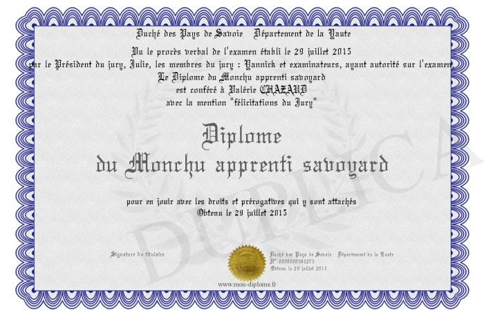 Envoyez par email votre Diplôme du Monchu apprenti savoyard personalisé