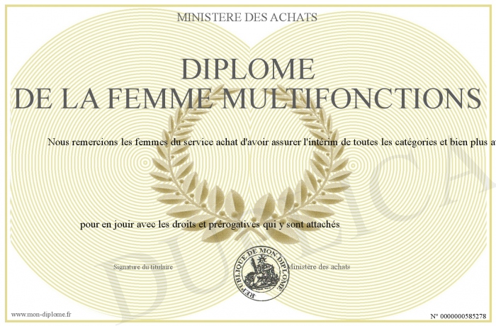 Envoyez par email votre Diplôme de la femme multifonctions personalisé