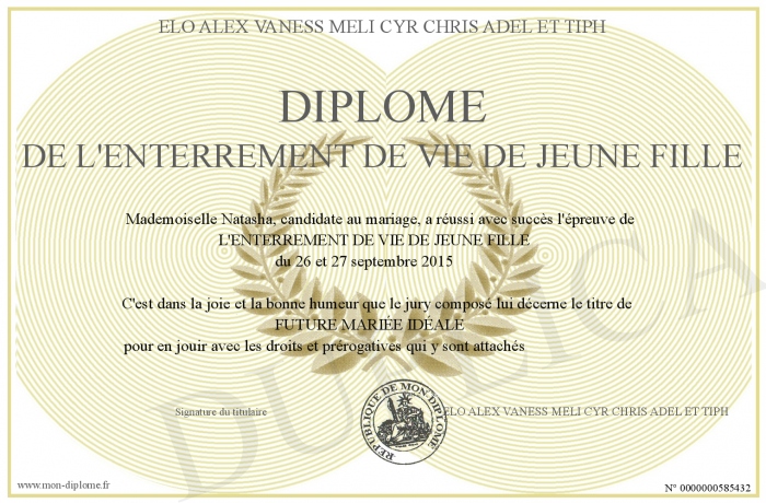 Envoyez par email votre Diplôme de l'enterrement de vie de jeune fille personalisé