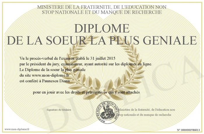 Envoyez par email votre Diplôme de la soeur la plus géniale personalisé
