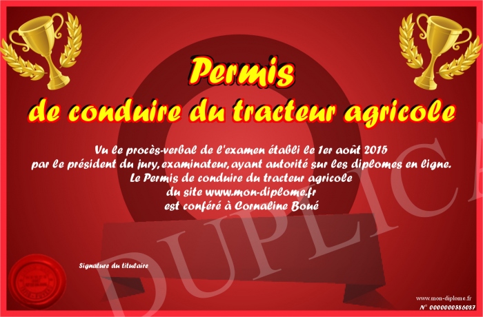 Envoyez par email votre Permis de conduire du tracteur agricole personalisé
