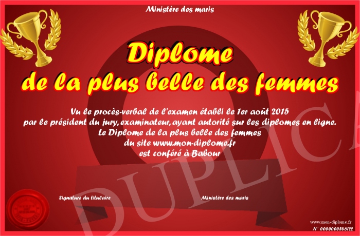 Envoyez par email votre Diplôme de la plus belle des femmes personalisé