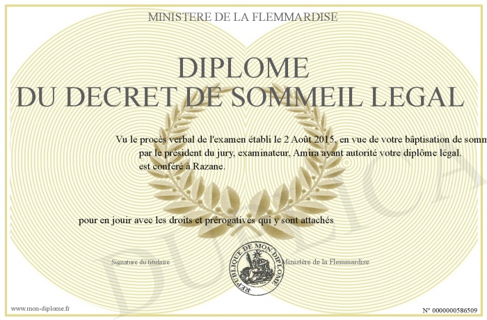 Envoyez par email votre Diplôme du decrèt de sommeil légal personalisé