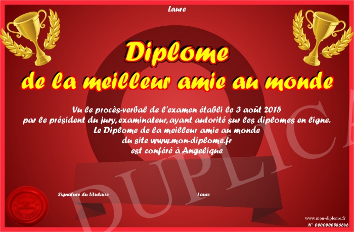 Envoyez par email votre Diplôme de la meilleur amie au monde personalisé