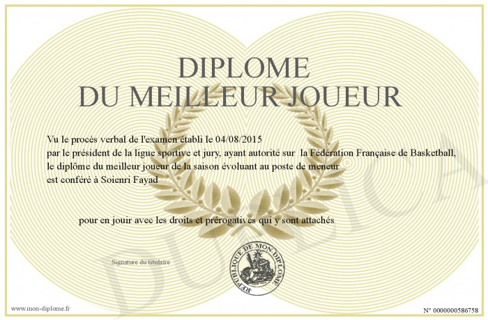 Envoyez par email votre diplôme du meilleur joueur personalisé