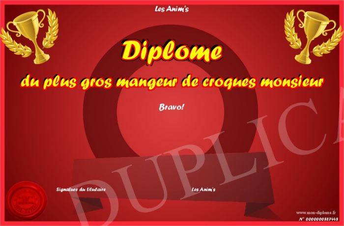 Envoyez par email votre Diplôme du plus gros mangeur de croques monsieur personalisé