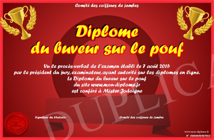 Envoyez par email votre Diplôme du buveur sur le pouf personalisé