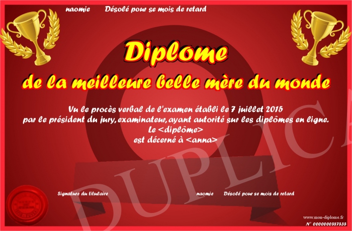 Envoyez par email votre Diplôme de la meilleure belle mère du monde personalisé
