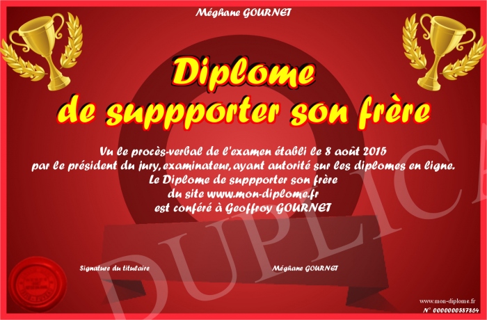 Envoyez par email votre Diplôme de suppporter son frère personalisé