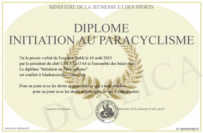 Envoyez par email votre Diplôme Initiation au paracyclisme personalisé