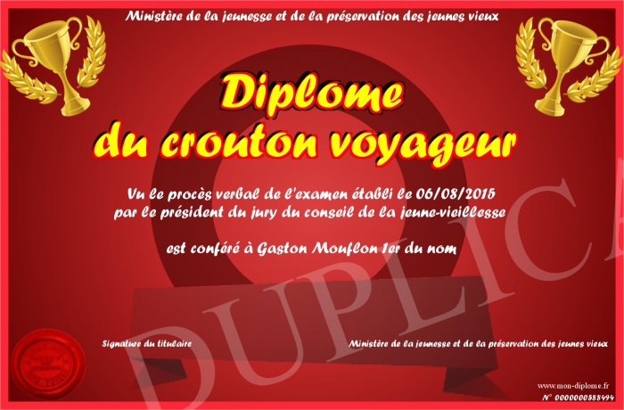 Envoyez par email votre Diplôme du crouton voyageur personalisé
