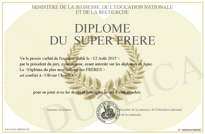 Envoyez par email votre Diplôme du Super Frère personalisé