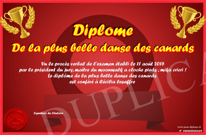 Envoyez par email votre Diplôme De la plus belle danse des canards personalisé