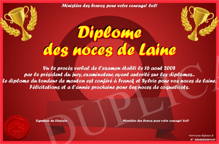 Envoyez par email votre Diplôme des noces de Laine personalisé