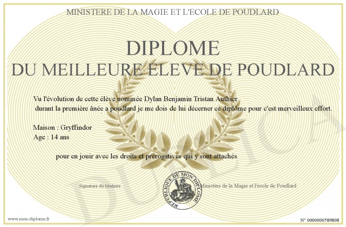 Envoyez par email votre Diplôme du meilleure élève de Poudlard personalisé