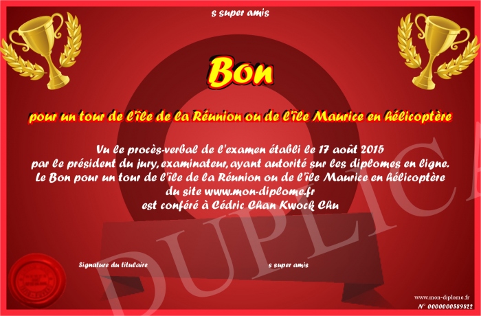 Envoyez par email votre Bon pour un tour de l'île de la Réunion ou de l'île Maurice en hélicoptère personalisé