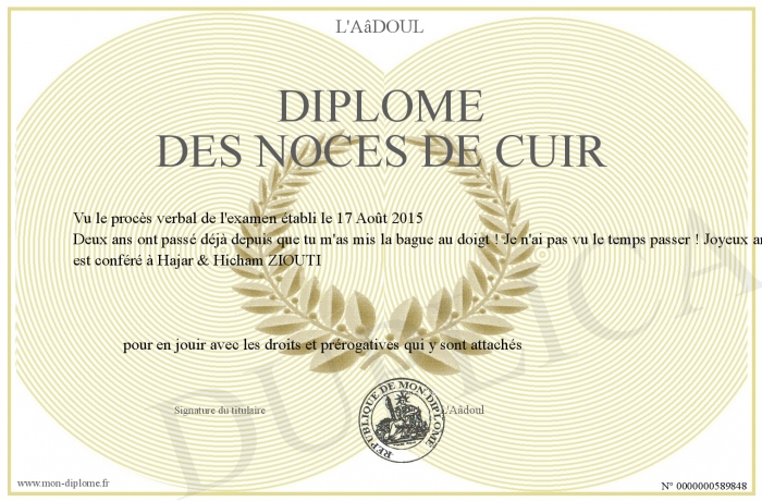 Envoyez par email votre Diplôme des noces de cuir personalisé