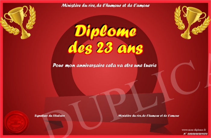 Envoyez par email votre Diplome des 23 ans personalisé