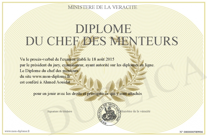 Envoyez par email votre Diplôme du chef des menteurs personalisé