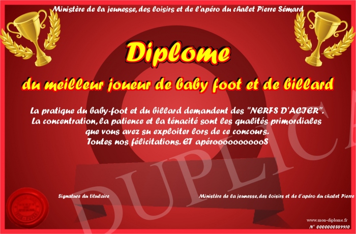Envoyez par email votre Diplôme du meilleur joueur de baby foot et de billard personalisé