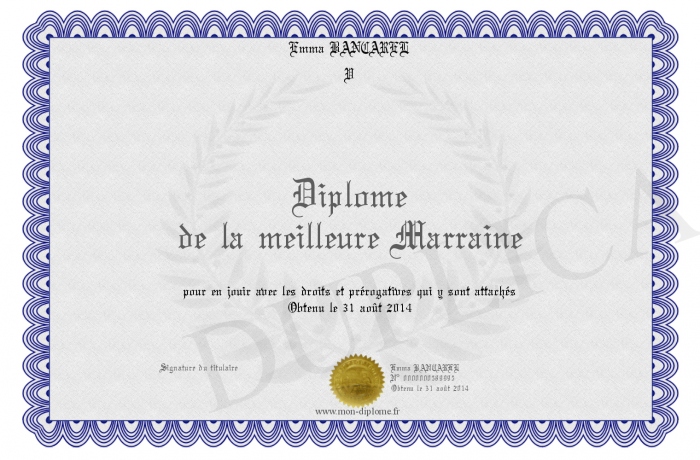 Envoyez par email votre Diplôme de la meilleure Marraine personalisé