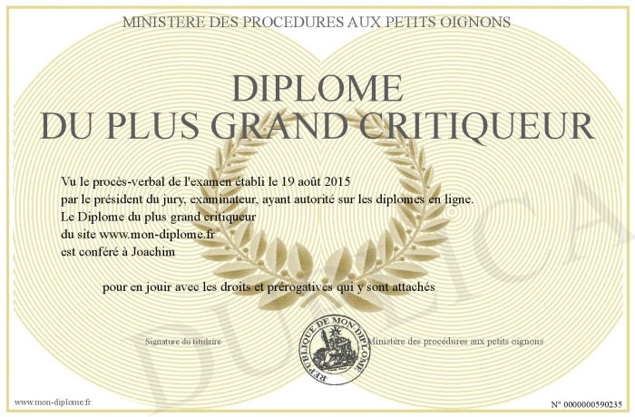 Envoyez par email votre Diplôme du plus grand critiqueur personalisé