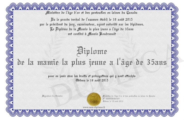 Envoyez par email votre Diplôme de la mamie la plus jeune a l'âge de 35ans personalisé