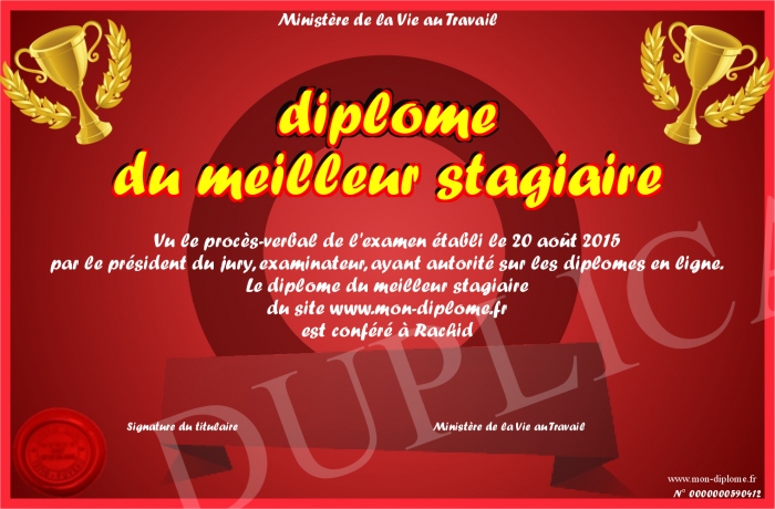Envoyez par email votre diplome du meilleur stagiaire personalisé