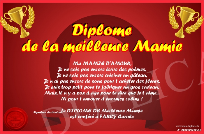 Envoyez par email votre Diplome de la meilleure Mamie personalisé