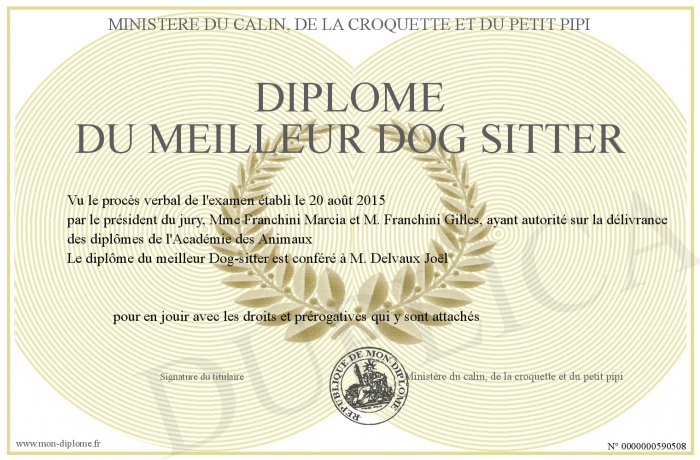 Envoyez par email votre Diplôme du meilleur Dog sitter personalisé