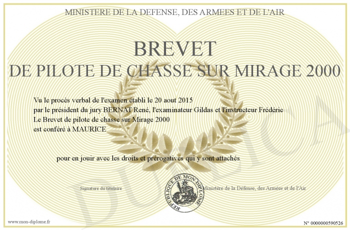 Envoyez par email votre Brevet de pilote de chasse sur Mirage 2000 personalisé