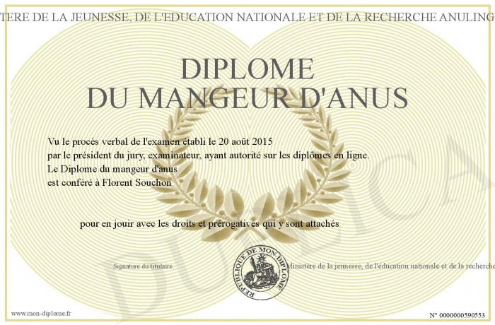 Envoyez par email votre Diplôme du mangeur d'anus personalisé