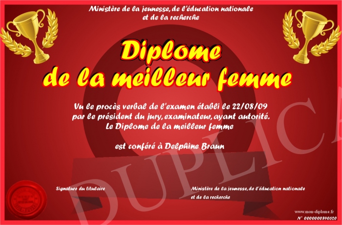 Envoyez par email votre Diplôme de la meilleur femme personalisé