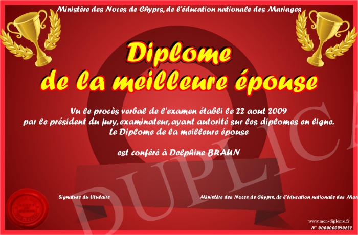 Envoyez par email votre Diplôme de la meilleure épouse personalisé
