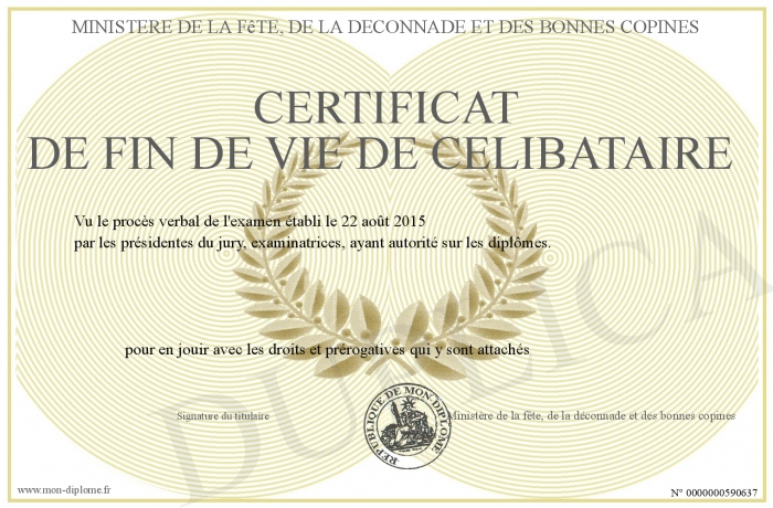 Envoyez par email votre certificat de fin de vie de célibataire personalisé