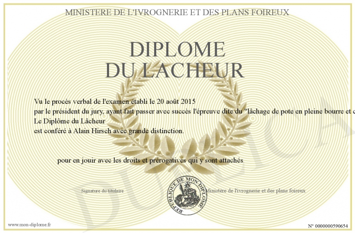 Envoyez par email votre Diplôme du lacheur personalisé