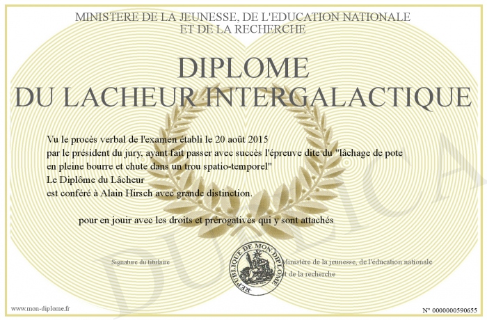 Envoyez par email votre Diplôme du Lacheur Intergalactique personalisé