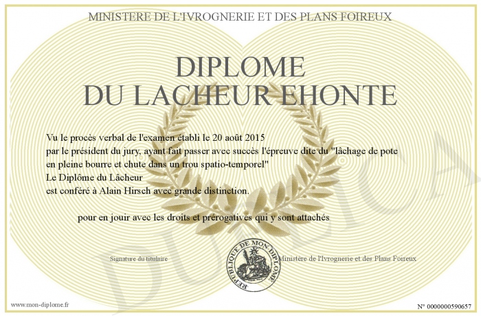 Envoyez par email votre Diplôme du Lacheur Ehonté personalisé