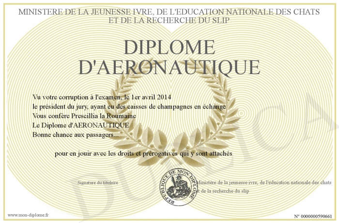 Envoyez par email votre Diplome d'AERONAUTIQUE personalisé