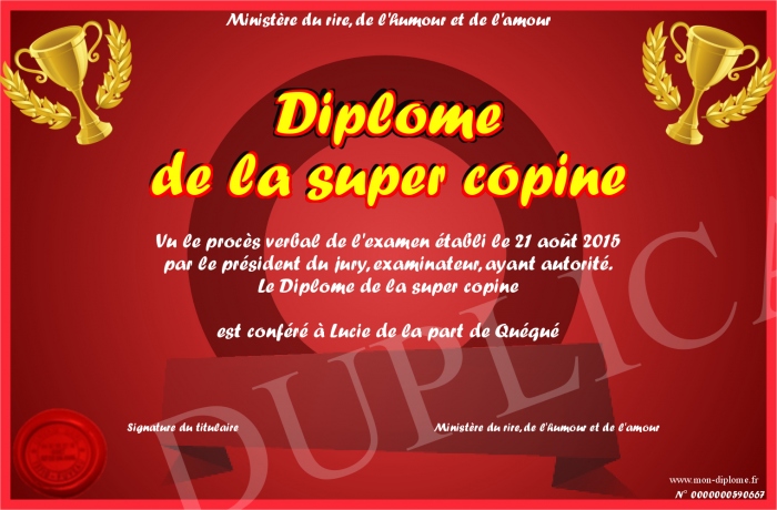 Envoyez par email votre Diplome de la super copine personalisé