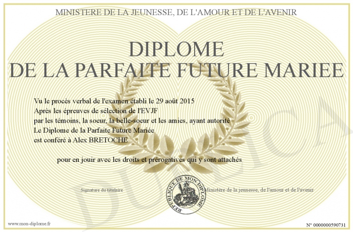 Envoyez par email votre Diplôme de la Parfaite Future Mariée personalisé